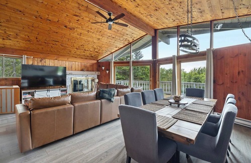 Step into a true Vermont experience as you enter this inviting 4-bedroom, 3-bathroom home. Designed for ultimate comfort and flexibility, this property boasts two distinct living areas and two fully equipped kitchens, ensuring ample space for everyone to gather or find a quiet moment. The main living area welcomes you with its warm wood accents and comfortable furnishings, centered around a cozy electric fireplace, perfect for gathering after a day on the slopes or exploring the countryside. Large windows throughout the house invite natural light and offer peaceful views of the surrounding landscape