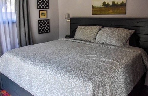The master room, located off the dining area on the main floor, boasts sliding glass doors opening onto the patio. It features an incredible king-sized bed and stylish accents throughout the room. The master bathroom is located next to the pantry on the left. It exudes a crisp, clean modern feel.