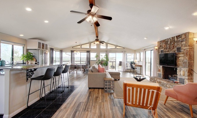 Incredible spacious open living area, vaulted ceilings, floor to ceiling windows over looking beautiful Lake Buchanan & Hill Country! Relax on wrap around deck, bird watch, swim in the large pool. Very quiet neighborhood. Fully equipped kitchen with Keurig, comfy furniture, bedroom downstairs has private entrance (only accessible from outside, bathroom is upstairs). Spacious bathroom with jet tub, huge walk-in shower, two sinks, private porch off bathroom. One block to boat ramp, playground, lake access, 5 minute drive to Spider Mountain and Reveille Ranch.