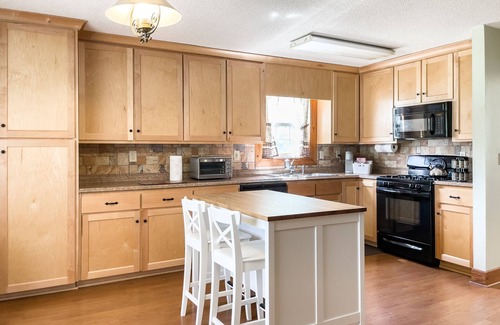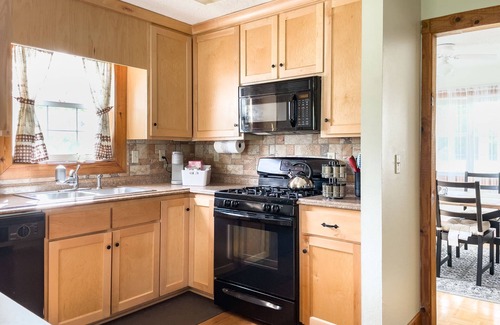 Formal dining room with large table connects to a cook's kitchen with gas cooktop and a full kitchen of appliances, cookware and dishes for your evenings at home. Ikea highchair in kitchen makes it easy to keep the littlest one close and simplifies your packing requirements.