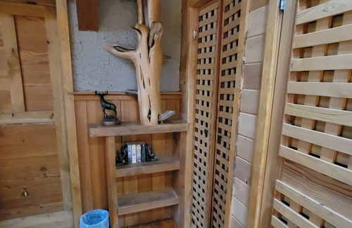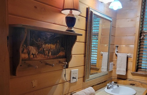 As you enter, you are welcomed with vaulted ceilings, exposed rafters and massive beams, showcasing a beautiful hand made sunburst sculpted of woods harvested from the property. Large architectural windows & skylights thoughtfully placed throughout the home maximize the beautiful views and fantastic stargazing opportunities. On the first floor you will find a well appointed kitchen, providing everything you may need to create gourmet or a simpler meal including several cook books. The dining area provides a large table, seating six guests comfortably. There are also two leaves to expand seating for 10 with extra chairs available upon request. Adjacent to the dining area, is the kitchen island which lends seating for three more guests. A large coffee/snack bar is fully stocked with hot beverages/condiments, popcorn & s'more making supplies. The living room features a large wood stove for cozy warmth and romantic ambiance. Comfortable furnishings with plenty of seating are the perfect place to curl up and relax. The oversized vintage wicker rocker placed next to the wood stove is a favorite spot to cozy up with a good book. A special reading nook under the staircase is set up for the little ones to have their very own cozy spot to enjoy. It is furnished with a tiny upholstered rocker, mini table with a carved bear lamp and a boat shaped shelf full of books & games. An 8’ 'oversized sliding glass door maximizes beautiful creek views and access to the deck, backyard & hot tub. Off the living room is the first of three bedrooms. It contains a leather twin size daybed with trundle for extra sleeping and rustic fishing themed furnishings and wall décor. The ground floor bathroom is fully equipped to include bath linens, rugs and toiletries for guests convenience. It features rustic pinecone décor and a newly added tile shower, providing a full bath on the main floor.