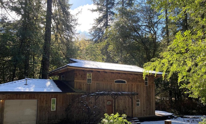 Experience the peace and tranquility this beautiful custom built "Cabin" style home located in Elliot National Forest has to offer. The home is surrounded by majestic old growth cedar and fir trees and lush natural landscape of giant fern, trillium & wild berries to name a few. There is also a beautiful array of planted rhododendron, jasmine, roses, daffodil, tulips and an enormous 50 year old wisteria draped over the front porch walkway. Several fruit trees, blueberries and fresh cooking herbs are there for guests to enjoy. The home overlooks historic Glenn Creek offering 150' of creek frontage, making it an excellent place to enjoy salmon and steelhead season! The creek also provides several private swimming holes and a small waterfall to enjoy. The backyard provides a wonderful place to relax and unwind with a glass of wine and a soak in the large covered 6 person hot tub overlooking the creek. A large expansive wraparound deck with plenty of seating and a gas grill provides a great place to barbeque, sunbathe or just relax with a good book! Evenings are especially fun roasting marshmallows, hot dogs and making s'mores in the backyard firepit. If you are a fisherman you will surely enjoy a cleaning station with hot & cold running water on both the back & front porch for guests convenience. This is also nice for rinsing off after hot tubbing or playing in the creek! The front porch is set with outdoor lighting draped from the wisteria covered awning. A metal bench and small bistro set frame the entrance to the front door.