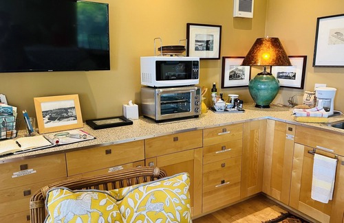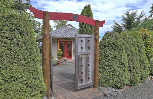 A quiet entry leads to an attractive studio cottage with lots of windows for views of the garden and Port Townsend Bay . Lots of outdoor sitting. On a covered porch guests can sit on rocking chairs to overlook the water and garden. Or go to the gazebo surrounded by garden to relax and if it is too cool turn on the gas heater to keep warm.