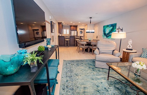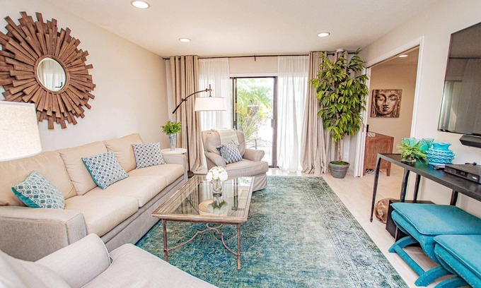 From the moment you enter Serene Hideaway, you are welcomed into a tranquil space with blue hues, natural textures and an inviting space to spend quality time with family & friends! The ground floor corner condo is easily accessible and has a walk-out patio where you can relax! The kitchen is fully furnished for your stay with all the necessities for the novice cook or the everyday chef! There is seating for two at the granite island for informal dining or a gorgeous wooden round table & seating for six with great ambiance from the glow of the dining chandelier. This dining area will make you want to "dive" in to your meal with our diver artwork full of color! Two comfortable swivel recliners and an upholstered sofa will be the perfect spot to enjoy some relaxing time playing games or watching your favorite movie on the 60" Samsung Smart TV with cable. The master retreat has a king bed and lots of natural light from the corner window, a 48" Sony TV and also has an en suite bathroom with a beautiful tiled walk-in shower and separate dressing area. The guest bedroom has two twin beds and a fun Florida vibe with a 44" Sony TV, and en suite bathroom with an updated tiled bathtub/shower & toilet area. We also have a rollaway twin mattress for sleeping an extra guest. The patio area is where you can enjoy dining or just sitting with your morning coffee to take in the calmness of the area or hear splashing in the pool. Evening time will be the perfect chance to relax out back on the patio and enjoy the Florida sky as it turns vibrant colors before setting & ending another spectacular day!