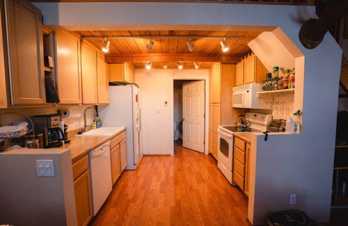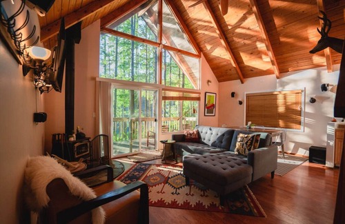 This cozy 1 bed + loft lake cabin is great for couples or small families who enjoy the outdoors! The bedroom features bunk beds for littles to snuggle down at bedtime. The loft features a mid-century modern Queen bed for the grown-ups. The décor is a mix of new items for your comfort + vintage finds. Basic kayaks, inflatables, and life jackets are provided for fun on the water! Sit on the deck or dock to enjoy the peace & serenity of this quiet, non-motorized little lake in the woods. 4 adult & 2 toddler-sized life jackets are provided. The kitchen is equipped with the essentials for preparing basic meals. Stacked laundry units in bathroom. The flat-screen TV can be used for watching DVDs/Blue-Rays or Netflix. The cabin now has fast, fiber internet service! NOTE: --Stairs to loft are steep and ladder-like, & are not recommended for anyone with balance or mobility issues. --Wood stove indoors & fire pit outdoors may be used only when no burn ban is in effect. Please exercise good judgment & take proper precautions with fire. --Lake is private & no lifeguard is on duty.