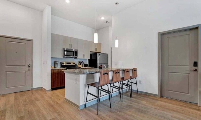 Step into style and comfort with thoughtfully designed spaces featuring luxurious wood-style flooring, stainless-steel appliances, and stunning tile backsplashes complemented by sleek granite countertops. Each home boasts high-powered Wi-Fi, a deluxe 65” flat-screen TV, and contemporary furnishings. Soaring nine-foot ceilings, designer lighting, and ceiling fans create an airy and inviting atmosphere.