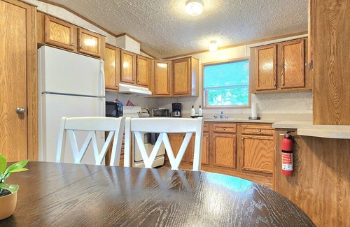 The home sleeps up to six guests comfortably with two private bedrooms and a pull out couch in the living area. It is pet friendly, so your four legged family members are welcome too. Inside you will find a fully equipped kitchen, a cozy living space perfect for unwinding after a day outdoors. Whether you are gathered around the fire, playing games, or enjoying a quiet morning with coffee, the setting is perfect for reconnecting and relaxing.