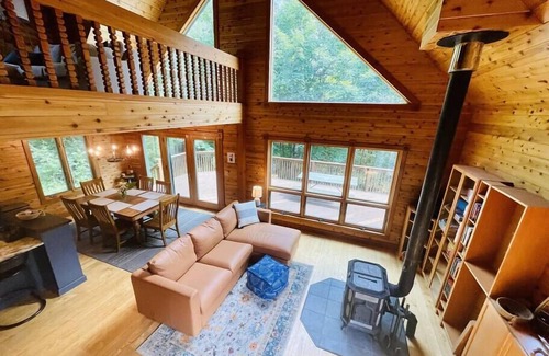 Step inside to discover a welcoming living space with vaulted ceilings and large windows that frame stunning forest views. The living room features a wood stove, perfect for cozy nights by the fire. The fully equipped kitchen makes meal preparation a breeze, and the dining area is ideal for family gatherings.