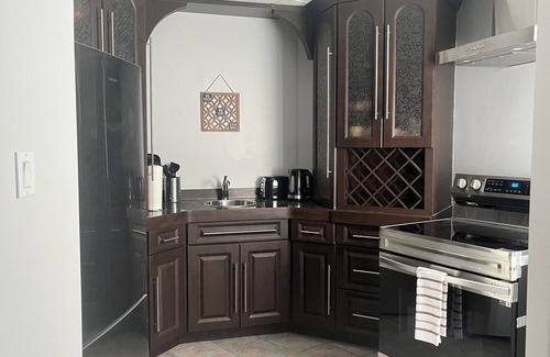 Spacious basement apartment having private entrance with free parking space for 2 cars, 2 bedrooms having queen beds, 1 full bathroom, open concept kitchen and family room, dedicated workspace, ironing board, patio facing huge backyard. Centrally air conditioning, heating, laundry on ground floor shared with host. Indoor fireplace, Smart Tv displaying cable, Netflix. Coffee maker with complimentary coffee & variety of teas. Kitchen is equipped with electric stove, microwave, electric kettle, toaster, mini fridge, refrigerator, crockery, cutlery, pots & pans & other kitchen tools to enable you cook food of yr taste within comfort of your house. There is a unique pool table to keep you entertained throughout the stay.