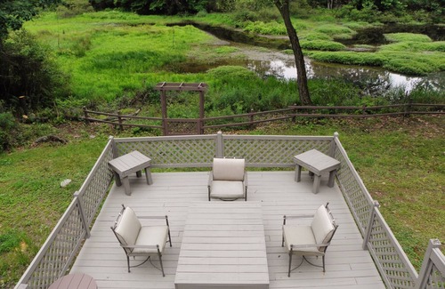 Secluded 3 bedroom/2 bathroom house with hot tub and multiple decks on scenic pond in the quaint town of Narrowsburg, NY. Just a 5 minute walk to Main Street restaurants, shops, and galleries, and the pristine Delaware River. maintenance, etc. Out of sight onsite manager to help with hot tub, maintenance, fire, etc.