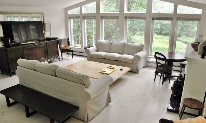 Serene luxurious lakefront w hot tub steps from Main St in hip Narrowsburgn is located in Narrowsburg. Serene luxurious lakefront w hot tub steps from Main St in hip Narrowsburgn provides accommodation, featuring Security/Safety, Wellness Facilities, Barbecue/Outdoor Cooking, among other amenities. This House features Security/Safety, Wellness Facilities, Barbecue/Outdoor Cooking, to make your stay a comfortable one.