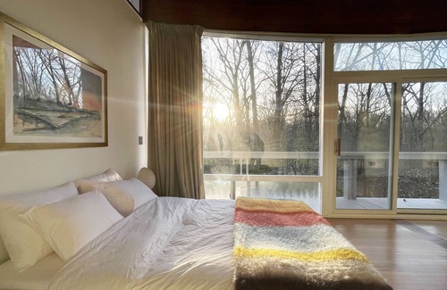 Located on 7 Acres of a private forest, The Falls is a stunning mid century modern retreat located 15min from Beacon and a mere 1.5h from NYC. The villa features a pool, hot tub, a fireplace and floor to ceiling windows in every room with 360 views of the surrounding forest, making it a breathtaking setting and a perfect getaway. It is perfect for both nature and design enthusiasts with nearby hiking trails, farms, museums, art galleries and fine dining restaurants. Follow us @thefallsupstateny