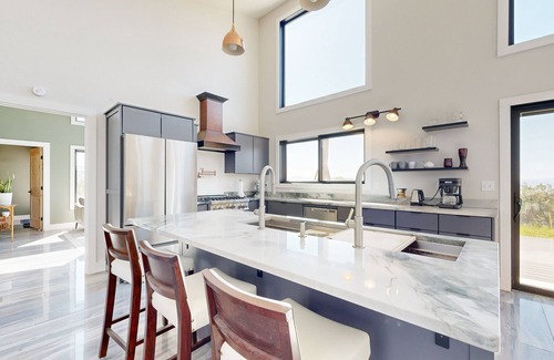 This family-friendly home features a spacious layout with a king bed, queen Murphy bed, and two XL twin beds, ensuring comfortable accommodations for all guests. The fully equipped kitchen includes modern appliances for convenient meal preparation.