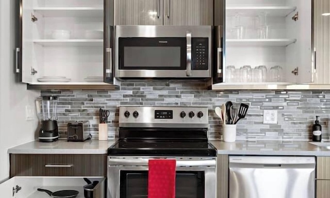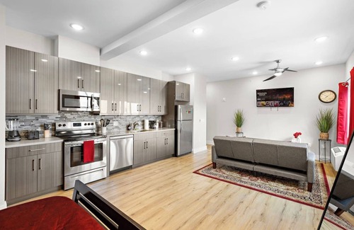 Discover NYC effortlessly! Minutes from Newark (NWK) & JFK airports, our location has a Light Rail station nearby. Enjoy a cozy stay with a memory foam queen bed, pull-out sofa, and a roomy walk-in closet. Stay connected with fast Wi-Fi, a dedicated workspace, and a 4k UHD Roku Smart TV. The bathroom provides complimentary toiletries, and the fully equipped kitchen ensures convenience. Benefit from a private garage, gym access, and an in-unit washer/dryer for a seamless experience.