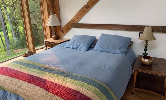 Located in Warren, this crafted post and beam home offers amazing privacy and beautiful surroundings. There are 2 comfortable bedrooms. The master bedroom has a queen bed and a hammock with a relaxing sitting space. There is a deck off the bedroom with seating and chez lounge. The second bedroom has a queen bed and a loft with a queen futon. A screened in porch has a queen bed and hammock that can be used to relax or as a 3rd bedroom in the warmer months. The main floor has an open floor plan with 2 living, gathering spaces, a dining area and a well equipped kitchen. The property is located in a beautiful setting with unparalleled privacy and abuts 8 miles of wilderness National forest. There are streams, rivers and waterfalls to explore surrounding the yard. The grounds have beautiful perennial gardens and vegetable gardens with fruit trees and blueberry bushes. A covered deck with Adirondack chairs is adjacent to the outdoor porch. In the backyard a dining table, is adjacent to a gas grill and a fire pit for relaxing and star gazing.