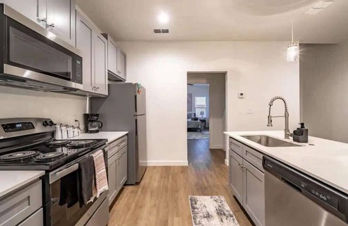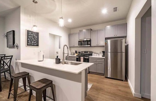 The kitchen is stocked with everything you should need to prepare a meal or enjoy take-out from one of Lubbock's many restaurants. There are 2 barstools along the kitchen counter for a quick bite or if you prefer a more formal dining spot, the adjoining dining table will seat 4 guests so that you can enjoy your meals or play a game together.