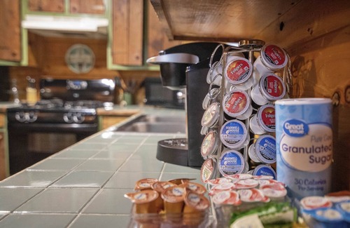 Basic stocked kitchen: Refrigerator, stove, oven, microwave, dishwasher, toaster, coffee maker (Keurig with pods provided), dishes, glassware, utensils, cutlery, seasonings, pots, and pans.
