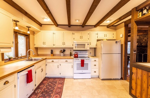 The first floor has a full country kitchen with plenty of counter top space, coffee/espresso machine and breakfast nook, which seats 4 and has one of the best panoramic views in the house. Across from the kitchen is an 8ft. walnut wood billiards table that compliments the exposed beam interior.