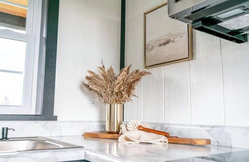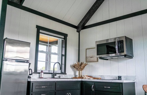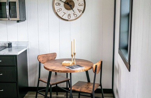 Welcome to your charming Shipshewana retreat! This thoughtfully designed tiny home offers all the comforts you need for a peaceful getaway. Inside, you'll find a cozy kitchenette with a dining area, perfect for enjoying meals at home. The main floor features a queen-size bed, while the loft area offers a second queen-size bed, providing comfortable sleeping space for up to four guests. Relax in the inviting space and unwind in the full-size bathroom with a refreshing shower.