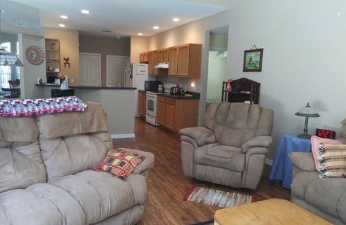 The home has a lovely family room along with a separate living room and dining room. Stroll in from the back porch into your private master bedroom with bath. Enjoy the cool Florida evenings on your large screen porch overlooking the country setting. There are two other bedrooms with a bathroom on the other side of the home. Also a separate washer and dryer area is near the large pantry in the kitchen. The home is equipped with 2 flat screen TV's, stove, refrigerator, microwave, and dishwasher. There is an outdoor grill for those BBQ events. The properties surrounding the home are all modern with acreage, and being this is an equestrian zoned area there are many horse activities around. Just a kick back and relax kind of place