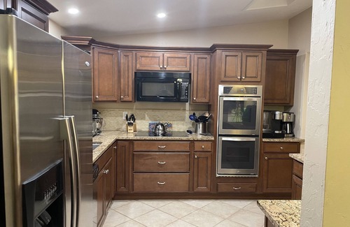 Two larger, more private bedrooms are located at the rear of the house separated from the living areas. The first one is a medium sized guest bedroom with queen bed and adjoining full bathroom with updated shower and granite covered sink. The second bedroom is a large owners suite with a king bed, huge closet, flat screen TV which opens into a brand new private, spa bathroom with double shower, double soaking tub and (yes) double sink - all topped by marble with white subway tile on the walls and mosaic tile on the floor. This new spa bathroom opens into an outdoor spa area that is separate from, but adjoins the pool and will include an outdoor shower and seating area. There is a hot tub in this spa area - that will be locked as it cannot be used by guests due to insurance restrictions (our apologies).