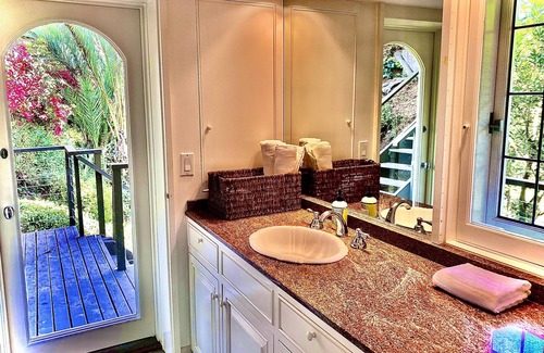 California dreaming in your own lovely guest suite studio. This sanctuary will lift your spirits while you gaze out the large windows at the lush greenery and are relaxed by the peaceful sounds of the gentle waterfall from the stream below. Nestled in a quiet, pristine, prestigious neighborhood; we welcome you to relax, take in this dreamy paradise, and breathe in the fresh ocean air. You are welcome to enjoy the scenic yard and common outdoor areas on the property including picturesque outdoor eating areas and lounge chairs in the yard. BBQ grill is welcome to our guests. Your suite includes a private deck and quaint outdoor dish washing station for your convenience. A short walk to famous beaches and the upscale yet adorable Corona Del Mar village with amazing restaurants and shops. Walk 10 minutes to Little Corona Del Mar State Beach and only a few minutes drive to Crystal Cove and Pelican Hill. Kitchenette amenities include a mini fridge, microwave, and toaster oven. Whether a romantic getaway, solo workation, or friends’ retreat, whatever your reason you will find the beautiful surroundings therapeutic and perfect for self care. Please feel free to ask for any local recommendations as we adore this community we call home. We hope you too will make yourself at home and enjoy the beach lifestyle!