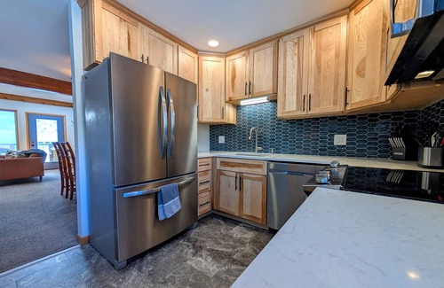 This house is sure to please with its open concept living space, and mountain modern aesthetic. Windows flood the house with natural light and views galore. You will be extra cozy in the brand new beds, couches and linens. The kitchen is well appointed for groups who like to cook. There is a wood burning fireplace that is sure to warm your feet after a long day of skiing.