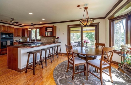 The home is open concept with a first floor master bedroom (king bed) with a tv and attached bathroom (with jetted tub and walk-in shower). The first floor also includes one other bedroom/office (with queen bed and built-in desk workspace + extra monitor with hdmi hookups). The living space has a breakfast nook, covered outdoor dining area, dining room, chef’s kitchen, living room with sectional, and a large front deck with a grill (1 propane tank provided per visit), outdoor furniture and hot tub. The second floor includes 2 queen bedrooms (one bedroom has full size futon in addition to queen bed) with closets, TVs, and a full bathroom. A sprawling yard surrounds the property, feel free to explore the grounds. There is a propane fire table on the deck, feel free to use it.
