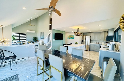 Serenity at Lake Joseph is a 2800+ lakefront home boasting spacious interiors, full chef's kitchen, two living rooms, game room, hot tub, firepit, hammocks, trampoline, four kayaks, row boat, paddle board, outdoor dining, grill, and more.