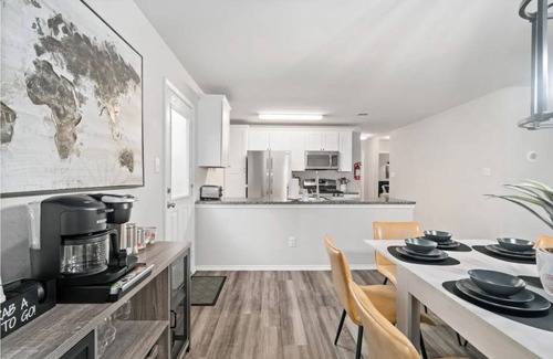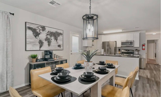 Three miles away from Lackland AFB, 20 mins from Sea World, 6 flags and the River walk, discover a contemporary and roomy family retreat. This residence features an expansive open floor plan, accommodating up to 6 guests. The master bedroom is fully equipped with a luxurious king bed, digital fireplace, large flat-screen smart TV, and a private ensuite. Guest room number 1 is ideal for the little ones, offering two brand-new twin beds. Guest room number 2 boasts a stylish queen bed configuration and a chaise lounge. Revel in the inviting living and dining area, perfect for bringing the whole family together for unforgettable moments!