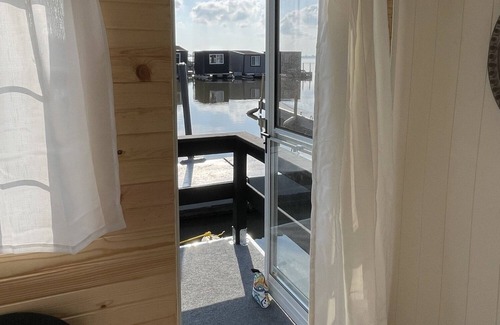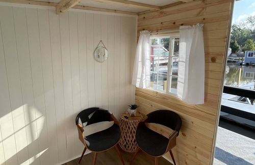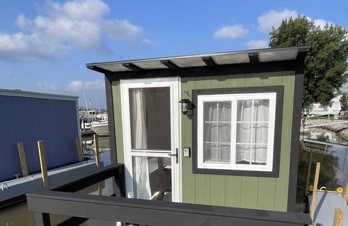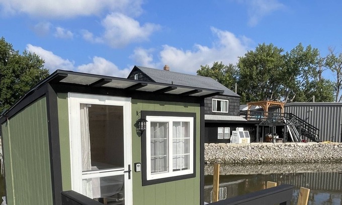 Unit remains docked at SoLSTAY Marina on Lake Erie's Castaway Bay. It is furnished with a queen bed, 2 modern reading chairs, a side table and under bed baskets for storage. Chairs can be taken in and out of the unit to enjoy the front viewing deck. This is a tiny houseboat located directly on Lake Erie. Each boat is unique. You will have to walk off the boat to use the restroom facilities and other amenities.