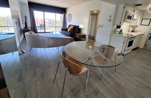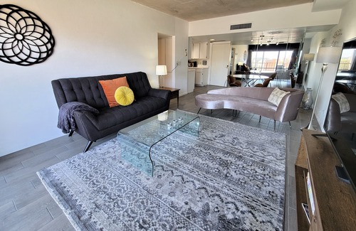 Take the elevator up to your 9th floor spacious and stylish mid century modern 1 bedroom condo with a full, updated kitchen and bath and marble tile floors. You will be safe here as there is staff on duty and private coded entry to the building. Equipped with Wi-Fi a 58” big screen Smart TV with cable and access to your own favorites like Netflix & Hulu. Bedroom features a comfy King bed. Access to gym, conference room, laundry room, and elevated outdoor pool at the third floor. Friendly door person in lobby from 8am to 8pm every day