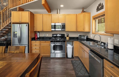 Enjoy the great room with dining and large open kitchen, cozy gas fireplace w/ 3 bedrooms, 2 on the main floor, one bedroom upstairs and an oversized loft. Sleeps 10. The central point of the cabin is the very comfortable great room that features soaring 30 ft. ceilings and luxurious reclining leather furniture. Relax by the fire and take in your favorite game or TV show on the 75” flat screen equipped with all streaming apps and Blu-Ray DVD Player and Sonos sound system.