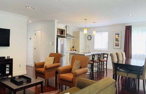 There is a fully equipped kitchen, smeg ceramic cooktop, smeg under bench oven, large fridge freezer, dishwasher, in-sink erator, the lounge features a Gas Log Fire place for the cooler evenings a 42 inch TV, ample seating for 6 guests – there is a also laundry with washing machine and dryer for guest use and a powder room with toilet and vanity.