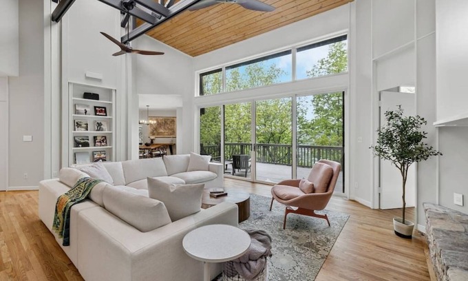 Enjoy unobstructed bluff views from the massive couch or oversized lounge chair. (Two kids or one adult can easily sleep on the couch.) Want to add some music? We’ve got you covered. Spin one of our 100 records on the turntable or pull up your favorites on Spotify and enjoy music throughout the home with a Sonos wireless stereo system.