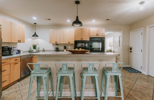 Loaded with amenities, you will find a clean space with all the conveniences of home. Shadowlawn features a large open kitchen with a stainless steel refrigerator, double oven, island stove, and dishwasher. The cabinets are filled with virtually everything you will need to prepare your own meals on days you rather stay in the comforts of home, rather than eating out at the numerous Ocean Springs hot spots. Up to eight can be seated at the large dining table, with additional seating at the nearby kitchen island.