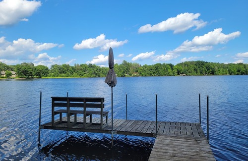 This lakefront home boasts many family-friendly spaces complete with a pool table and bunk room with a Lego table! Shady Crest is a two level home which can sleep 16 people. There are 5 bedrooms plus a Lego/ Bunk room, and 3.5 Baths. Everyone has a bed - 5 king beds and 10 twins. Enjoy the open floor plan, fireplace, wall of windows and deck looking over the lake and the peace and quiet you would expect with a property at the end of the road, next to the woods and on the lake. The yard contains a small apple orchard - late summer and early fall guests are welcome to pick and enjoy!