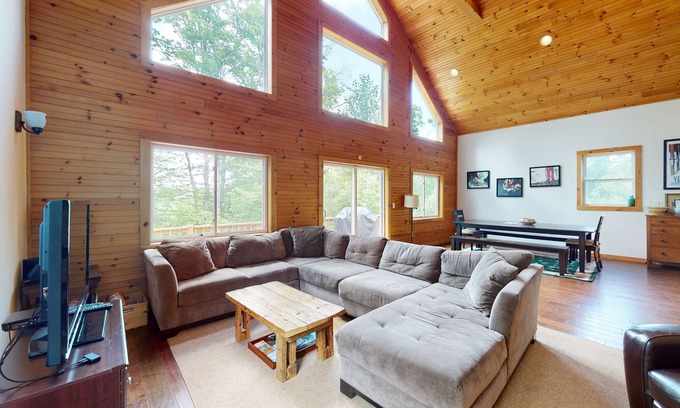 This fantastic home away from home has a large two-car garage with an attached mudroom and plenty of storage for all of your winter and summer equipment, so don't hesitate to bring those along! Upon entering, you will discover an open-concept kitchen, dining, and living area with cathedral ceilings and many floor-to-ceiling windows allowing for natural light and views of the valley. Prepare culinary masterpieces in the beautiful, well-appointed kitchen with custom cabinets, a large island, granite countertops, and stainless steel appliances. In the spacious dining room, you can find a large farmhouse dining table that will seat 10 or more. The living room provides you with a great spot to unwind with a large sectional couch and a TV with a DVD player. You can also spread out in the large finished basement