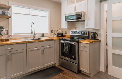 This property includes:• 300 MBbps fast speed WiFi • Two new 65” & 43" smart flat screen LED TVs with Roku• Free Parking for 4 or more cars • New appliances/high-end furniture: stainless-steel electric stove, oven, microwave, refrigerator, coffee machine, washer & dryer, couch/sofa bed, pop-up coffee table, mattresses, bedroom set, breakfast bar/stools, office set, and more1-bed/1 bath unit located on the ground-floor has:- a fully kitchen with a snug breakfast bar and stools,- a living room with a pull-out couch/sofa bed, a mid-century console table + a pop-up coffee table, and a 65" smart TV,- a contemporary designed bathroom - a bedroom with a new 14" queen size memory foam mattress, a high-low adjustable bed base, a work desk, an upgraded closet, and a 43" smart TV, - a queen size air mattress for extra guest(s). Washer & coin-operated dryer are in common laundry room downstairs.