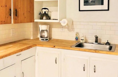The main floor has small vintage kitchen, a bathroom with a clawfoot tub and two smaller bedrooms, one with a queen bed and one with twin bunk beds. The main floor also has a great room with a large dining table and a living area where everyone can gather around the wood stove and play games or watch the waves crash on the Twin Rocks.