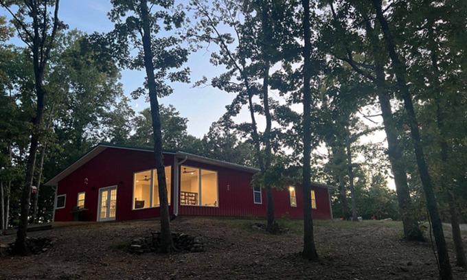 Why pick between the feel of a rustic cabin and a contemporary studio when you can have both at this Lake of the Ozarks vacation rental? This property provides a restful retreat with amenities with a full kitchen and free WiFi to help set the tone of your vacation. Guests can enjoy a lovely view of the forest and Trail down to the lake, a perfect summer pastime. As you sit in the morning with your coffee or evening drink you can enjoy the deer and turkey looking out the large, beautiful windows or sitting in the deck. Located within eleven acres of private nature reserve. You can fish from the dock or enjoy swimming off the swim platform. 1 private bedroom features a queen bed, and open bedroom featuring king bed in the living area. If you enjoy watching tv from bed there is a 52in tv in the living area for viewing from the sofa or the king bed. Wake up to the sun peeking through the trees and enjoy coffee on the deck as you watch the plentiful wildlife go about their morning routines. Cook breakfast in a full kitchen and take a stroll down to the waterfront where you can fish and enjoy the dock and swim platform.