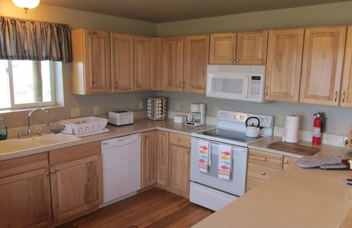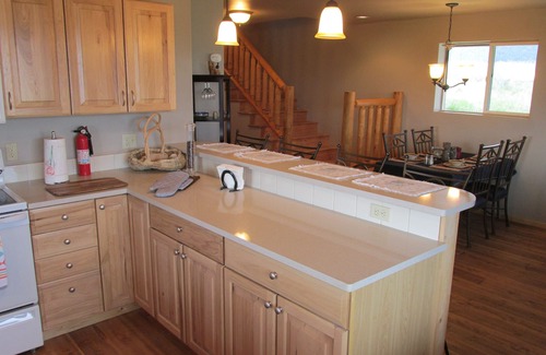 All of the comforts of home are available to you during your vacation at Sheep Mountain Cabin. Your accommodations include fiber optic internet and WiFi, internet TV, a land phone line, and a washer and dryer. The lower level of the cabin has a full kitchen with Silestone countertops, new appliances, dishwasher, and circular sawn Douglas Fir floors. On the main level you will find the living room with astounding mountain and valley views, along with a cozy propane stone, circular sawn Douglas Fir floors, vaulted ceilings, and a ladder that leads to the spacious loft area. The cabin comfortably sleeps 8. On both the main and lower levels there is a bedroom with a queen bed and adjoining full bath. The loft area has two sleeping areas (one with a queen bed and one with twin beds) separated by a closet and 1/2 bath.