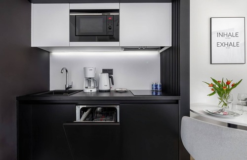 The living space consists of an entrance hall, living room with kitchenette, bedroom and bathroom with shower and toilet. In addition, the living room comes with a private balcony, where you can take in the fresh coastal air and enjoy a sip of aromatic morning coffee. A spacious living area with a sofa bed and TV provides the perfect place for rest and relaxation, as well as a bedroom with a comfortable double bed in the bedroom. The room also has access to a furnished balcony. Guests can use the high-speed free Wifi connection. The kitchenette is equipped with high-quality household appliances to prepare your favorite meals. The unique decor and comprehensive equipment with necessary kitchen and bathroom accessories guarantee a comfortable stay. The apartment is equipped with basic amenities such as an iron, ironing board, vacuum cleaner and hair dryer. A complimentary set of toiletries (soap, shampoo and shower gel), towels and linens are provided to help start each stay. The property is equipped with everything you need to relax. Functional, tastefully decorated space in classic white, gray and black, makes the apartment elegant and has a unique, peaceful atmosphere.