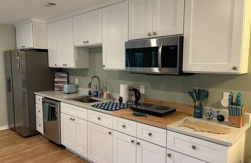 Please note that the kitchen has an electric stovetop and a microwave but no oven (due to county restrictions). There is also a fridge, dishwasher, toaster, and Nespresso coffee maker in the kitchen area.