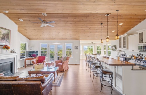 This beautiful vacation home located in the private gated community of River Oak is 90 minutes from Washington DC, nestled between the George Washington National Forest and Shenandoah National Park just above the South Fork of the Shenandoah River. This newly constructed home with private 3.5 acre lot was completed in November 2017. It features 3 bedrooms, a fully equipped kitchen, fireplace, and Great Room all offering amazing views of the Shenandoah Valley. This home can accommodate from 1 to 6 people. Two master suites located on the main level feature one king bed, and one queen beds and private master baths with showers. An over-sized soaking tub, located in one master suite is a welcome refuge after a long day of hiking. The third bedroom located on the lower level, features Queen bed and a private full bath. Internet access for remote work on property. There is also a finished Rec-room on the lower level. An outdoor patio and dining area. Decks with grill, dining set, chairs all overlooking amazing views. All living areas and bedrooms have spectacular 180 degree mountain views. Private river access with a Pavilion picnic table on the river within River Oak community.