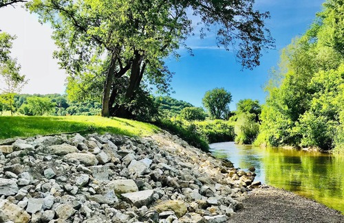 One bed cabin with two pullout couch sleeper beds. Fishing on trout stream is 50 feet away. Owner has 1800 feet of owned river frontage. Very good for trout fishing and sandy bottom for swimming. The property has a private 20 by 50 foot beach with steps to the river. Town is one mile away with 3 bars with restaurants and dollar general for supplies. Clean porta john toilet and enclosed cedar shower with lock. Outside sidewalk from door to door.. River area is very private and secluded. Gate can be lock for entire are for total privacy if wanted. Fish for trout and watch the eagles on the river. Firewood for fire is provided for guests. Crystal Cave and Vino in the valley minutes away. Lots of clear star viewing at night.