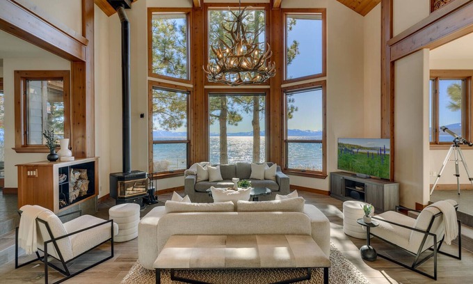 The custom, grand wood and steel entry doors welcome you to the great room where you can bask in abundant sunlight year-round with southern exposure through the floor to ceiling windows. Panoramic views of the lake and snowcapped mountains are the artistic backdrop for the great room with a wood burning stove for cozy winter nights, a formal sitting room for enjoying a good book and a spacious kitchen / dining room for creating elaborate holiday meals. With 3,065 square feet of interior living space, 3 bedrooms plus an additional doorless area with a king bed, and three full bathrooms, there is a no shortage of space for individual respite. The primary suite is a truly a dream with a balcony for star gazing and watching the moon cast its glow on the shimmering shores of the lake. The two guest rooms share a Jack and Jill bathroom and down the hall at the west end of the home is a 4th sleeping area with a king bed. The professional interior design showcases the home with a modern mountain style and the owners have ensured that every detail desired for a luxury experience is present.