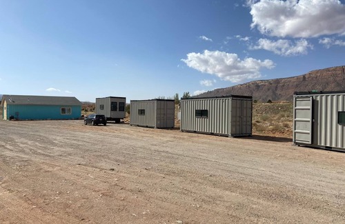 Newly constructed shipping container home! 10 minutes from downtown Moab. Sleeps 18 with 9 individual beds! Easy access to hiking and riding trails. Within an hour of both Canyonlands and Arches National Parks. Designed to be used by groups with plenty of parking, large common spaces, large dining table. Great views of the La Sal mountains and the red rock cliffs of the Moab rim.