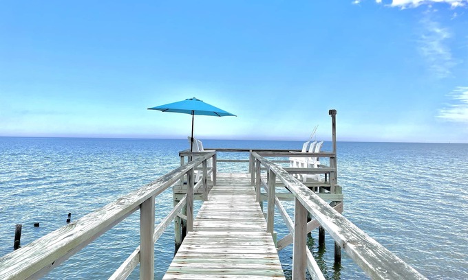 Ships Watch is located on the very tip of the Stingray Point peninsula in Deltaville where the Rappahannock and the Piankatank Rivers meet the Chesapeake Bay! Where the road runs into the Chesapeake Bay is where Ships Watch is located! The water views are impeccable and the sunrises are breathtaking! If you are looking for an unforgettable vacation rental in Deltaville directly on the Chesapeake Bay, Ships Watch is it! It doesn’t get any better than this in Deltaville! If you want to relax to the sound of the waves, panoramic views, ships on the waterline, fishing boats, sail boats, jet skiers, kayakers, dolphins, yes DOLPHINS, Ships Watch is it! You can fish and crab right from your very own private dock and prepare dinner in your gourmet kitchen or on the grill. Relax on the wrap around screen porch, enjoy margaritas in the captain’s chairs on the private dock, go swimming, play corn hole, and croquet! It’s always 5 o’clock at Ships Watch! The Chesapeake Bay can be seen from 17 of the 19 windows at Ships Watch! You will not want to leave! Take a walk around Stingray Point, it is peaceful and family friendly! Enjoy a fish fry, steam some crabs, roast some oysters, bring your boat, bring your jet skis…you deserve to have the time of your life! Let the salty air get in your hair!
