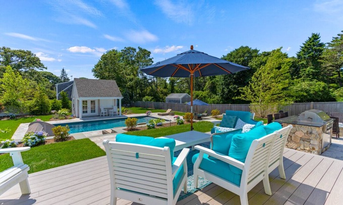 Here's your Chatham summer home --- for a week, a month or possibly all summer long! Built in 2020, everything here is fresh, new and top of the line. Outdoor warm weather living doesn't get any better. Whether you're lounging on the expansive deck or travertine patio watching the kids splash in the heated saltwater pool, or firing up the built-in gas grill with granite counters to enjoy a perfect dinner al fresco. Later on, you'll want to gather around the handsome fire table for gazing at the stars. You'll also find a handy outdoor shower plus a sizable pool cabana.